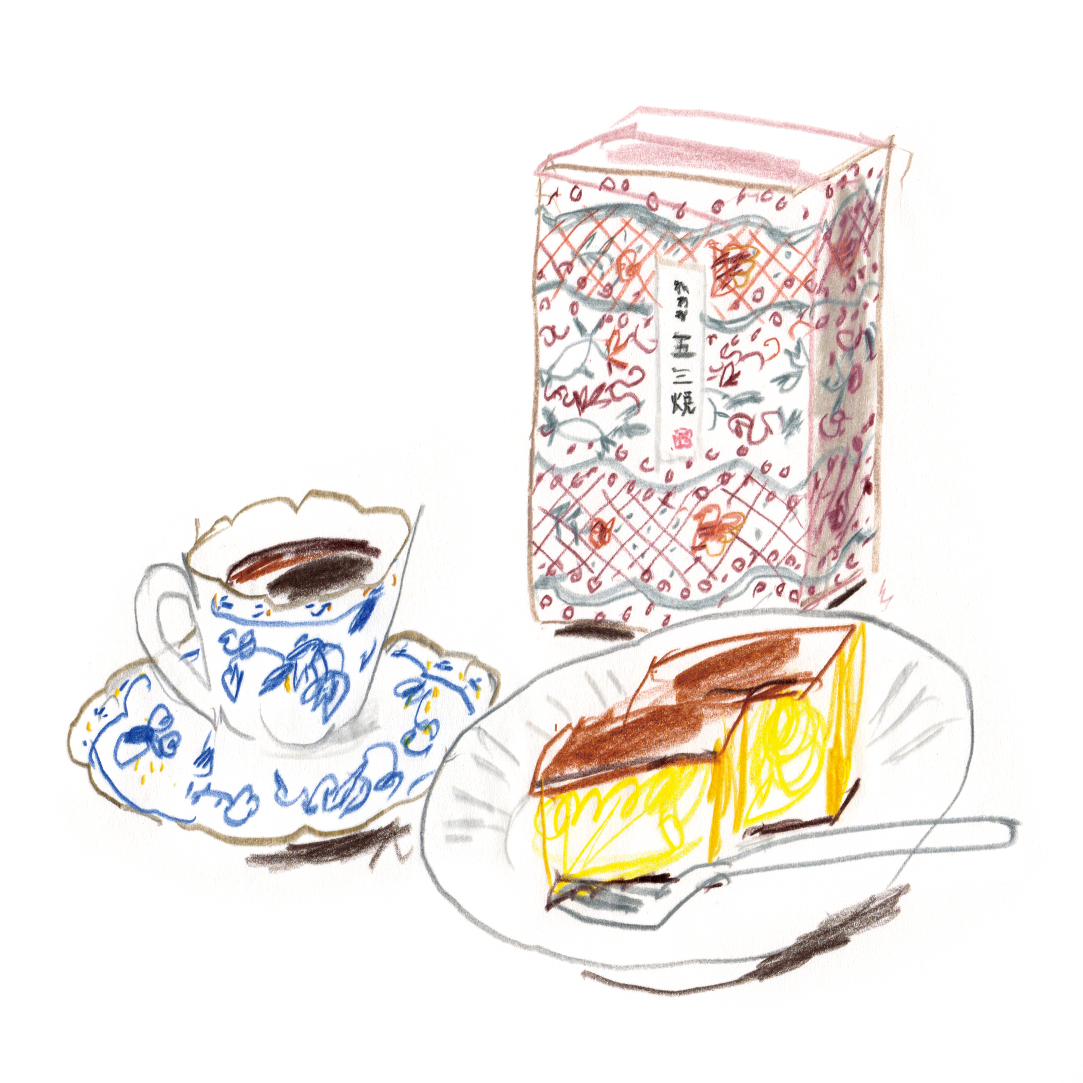 その名前が変化して、五三焼が誕生しました。卵黄と砂糖をたっぷり用い、生地のしっとり感を増した五三焼は、口の中でほどける上品な舌触りが信条です。喫茶セヴィリヤでは、五三焼カステラセット(お飲み物付き1,375円・税込)でお楽しみいただけます。